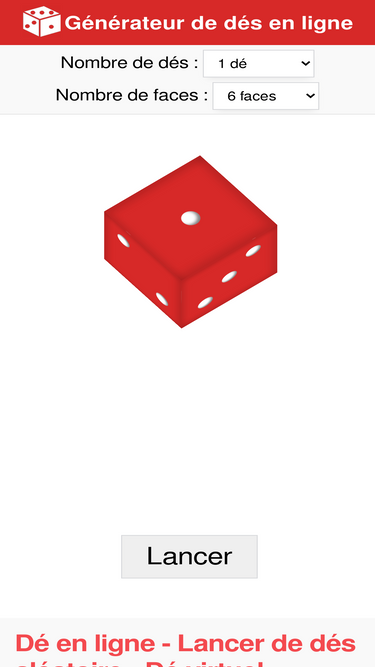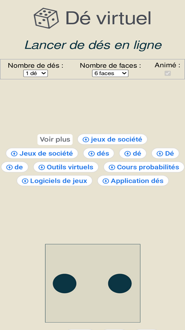 76%simulateur de dés en ligne (avec animation). tout nombre de faces. pour les jdr, les jeux de société, les jeux de hasard et tout ! ⚀ ⚁ ⚂ ⚃ ⚄ ⚅ ∞