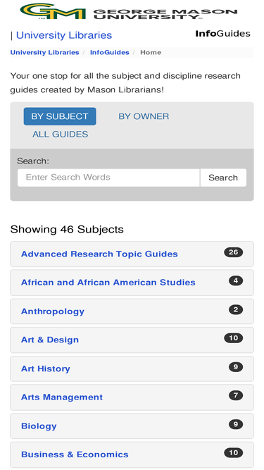 98%Welcome! Subject and discipline research guides created by Mason librarians.