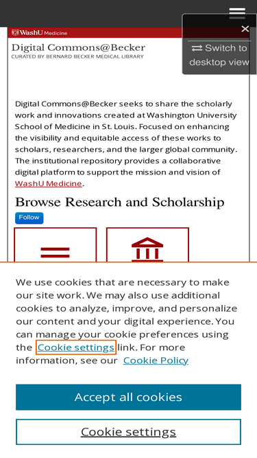 87%the institutional digital repository for scholarly publications and articles created by the school of medicine at washington university in st. louis. the works cover multiple disciplines such as oncology, genomics, pediatrics, translational medicine, psychiatry and audiology to name a few. collections include journal articles, meeting abstracts, capstones, research papers, poster presentations, newsletters, videos, sound files, data, protocols, code, and more.