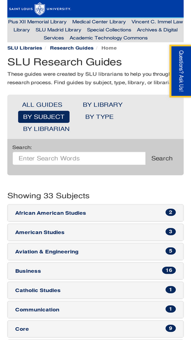 95%SLU Research Guides These guides were created by SLU librarians to help you through the research process. Find guides by subject, type, library, or librarian.