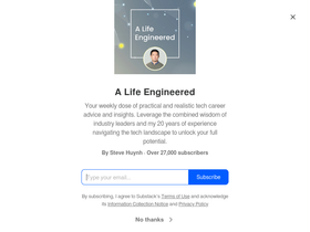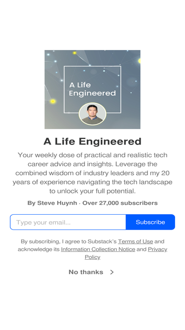 73%your weekly dose of practical and realistic tech career advice and insights. leverage the combined wisdom of industry leaders and my 20 years of experience navigating the tech landscape to unlock your full potential. click to read a life engineered, by steve huynh, a substack publication with tens of thousands of subscribers.