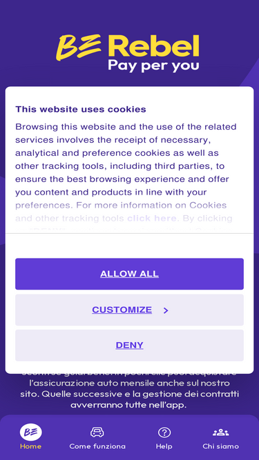 86%BeRebel è l'assicurazione auto a chilometri, con pagamento mensile e senza vincoli di durata. Scopri la tua tariffa personalizzata e sottoscrivi la polizza auto.