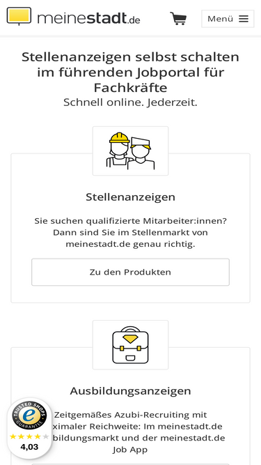 78%schalten sie ihre stellenanzeigen, ausbildungsanzeigen und minijobanzeigen im online-stellenportal meinestadt.de.