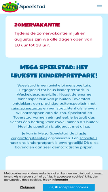 Speelstad is een unieke binnenspeeltuin, uitgegroeid tot heus kinderpretpark, in Wechelderzande-Lille . Naast de enorme binnenspeeltuin kan je buiten Toverstad ontdekken: een prachtige buitenspeeltuin met ruim zonneterras. Speelstad en Toverstad vormen één geheel, je betaalt dus slechts één bedrag voor zowel binnen als buiten! Heel de speeltuin is uitgerust met airco. Je kan in Mega Speelstad de fijnste verjaardagsfeestjes organiseren. Een schoolreis naar ons kinderpretpark is onvergetelijk!
