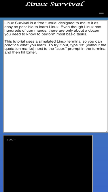 98%linux survival is a free interactive online linux tutorial. it includes a linux console simulator where you can type commands and see the results. learning linux is easy when you get hands-on practice.