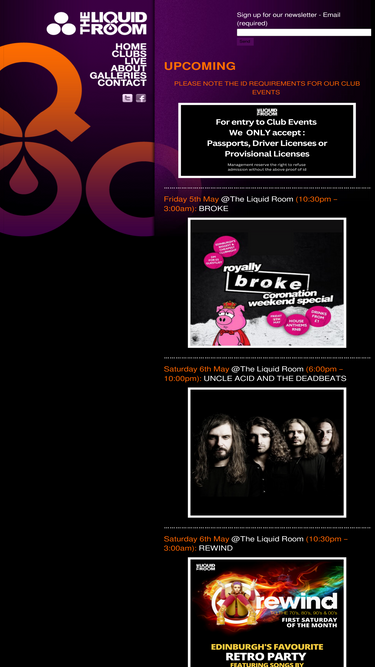 73%for over 10 years the liquidroom has been entertaining music fans in and around scotland buy hosting gigs and events 7 days a week , 365 days a year.
