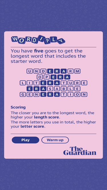 85%play the guardian's new daily word game, and share your score with your friends. you have five goes to get the longest word including today's starter word.