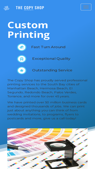 100%the copy shop has served the south bay with professional printing and design services for over 43 years. manhattan beach printing, hermosa beach printing, redondo beach printing, marina del rey printing, el segundo printing, hawthorne printing, inglewood printing, westchester printing, palos verdes printing, los angeles printing, torrance printing