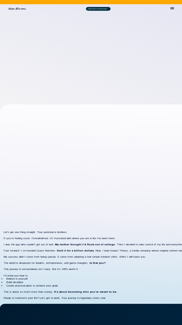 92%Transform your life with Tom Bilyeu, mindset master and $1B+ founder. Get free guides on entrepreneurship, personal growth, and achieving your goals.
