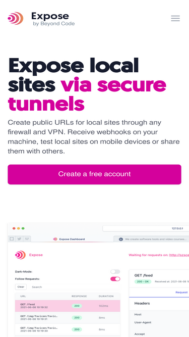100%Create public URLs for local sites through any firewall and VPN. Receive webhooks on your machine, test local sites on mobile devices or share them with others.