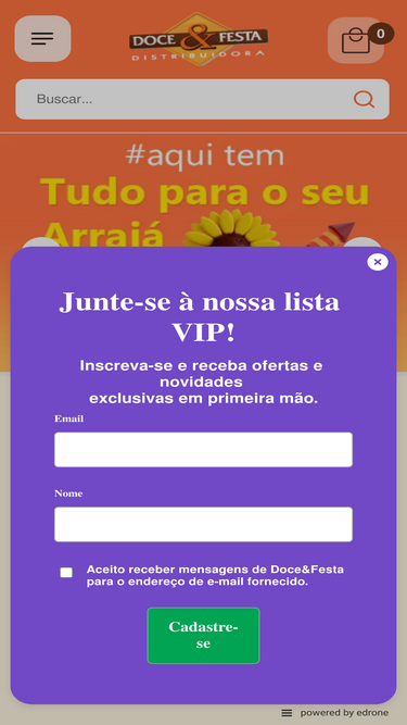 89%Vendemos de tudo para sua loja, festa, café da manhã, ou confeitaria. Como biscoitos, balas, goma de mascar, chocolates, salgadinhos, utensílios de confeitaria, decoração de festa, descartáveis, essências, corantes, açúcares, farináceos, e vários doces.