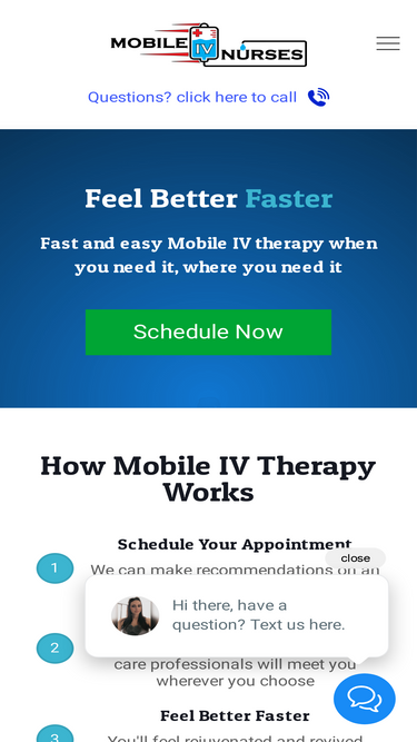 98%ivtherapy2go: 24/7 mobile iv therapy and hydration services. we offer a variety of iv packages tailored to your needs, with clear and transparent pricing available on our website. as the #1 mobile iv therapy service, we replenish essential fluids, electrolytes, vitamins, and antioxidants. enjoy affordable, convenient, and professional iv therapy delivered right to your doorstep. enhance your wellness, recover faster, and stay hydrated with our specialized treatments for athletes, jet lag, hangovers, and more. book now for immediate care at your home or workplace.