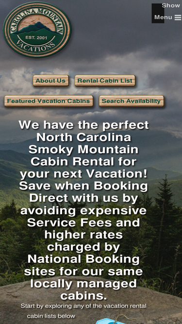 97%Carolina Mountain Vacations has a large selection of North Carolina smoky mountain log cabin rentals and vacation homes from 1 bedroom cabins to 5 bedrooms lodges located throughout the Bryson City, Cherokee, and Nantahala areas bordering the Great Smoky Mountains National Park; perfect for romantic getaways, restorative escapes, family vacations or a basecamp for outdoor adventures and sightseeing trips.Vacation planning services available for free to registered guest. Centralized Bryson city office staffed 9am to 9pm, 7 days.