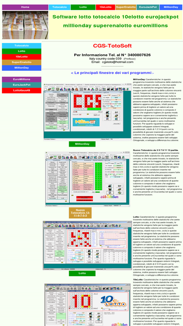 96%se cercate dei programmi per il gioco, al millionday, lotto, superenalotto, totocalcio, 10elotto, euromillions, eurojackpot, siete arrivati al capolinea. con questi programmi potete progettare il vostro sistema analizzandolo in tutte le maniere possibili.