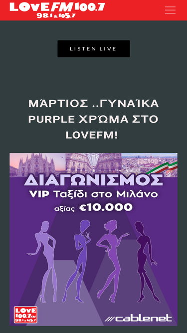 94%Η επίσημη σελίδα του Love FM Cyprus. Μπορείτε να μας ακούτε στους 100.7, 88.7, 105.7 και 103.3.