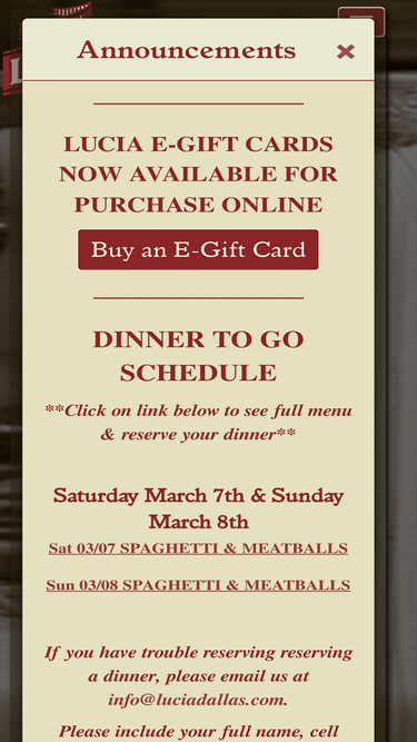 100%Located in the Bishop Arts District, Lucia is a small, chef-owned Italian restaurant. The menu changes frequently and features house-cured salumi, homemade pasta and freshly baked bread made in house daily.