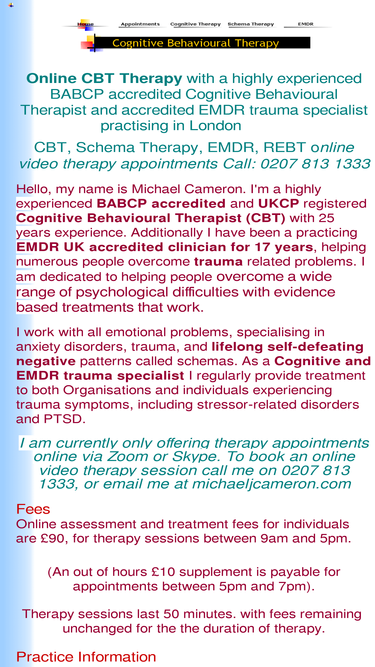 cognitive behavioural therapist cbt onine and in london wc1 and n12 offering specialist treatment, explains why cognitive therapy, emdr and schema therapy are effective treatments for emotional and psychological problems
