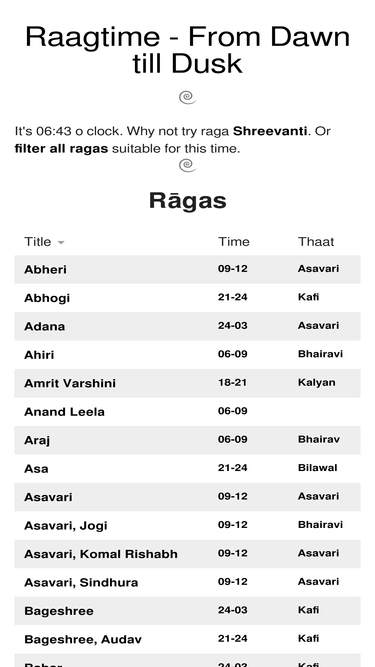 79%raagtime is a database of indian ragas (classical music) including spotify links for listening and recommendation of what time of day they should be listened to.