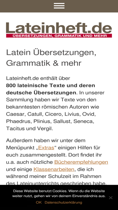 64%Diese Seite enthält zahlreiche lateinische Texte und deren deutsche Übersetzungen. Die Texte stammen von den bekanntesten römischen Autoren wie Caesar, Catull, Cicero, Livius, Ovid, Phaedrus, Plinius, Sallust, Seneca, Tacitus und Vergil. Desweiteren können Sie auf Lateinheft.de unter dem Menupunkt Extras weitere Hilfen zum Thema Latein finden. Wir wünschen Ihnen viel Spaß auf lateinheft.de Um direkt