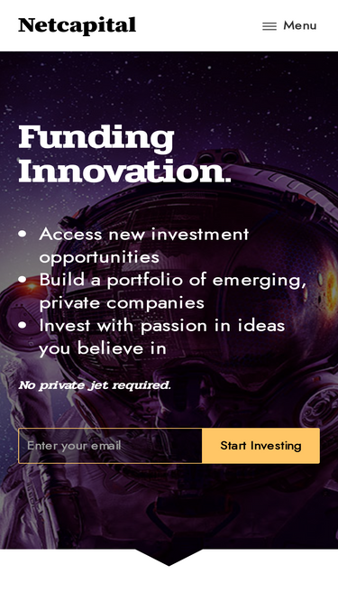 76%Netcapital makes it easy for anyone to invest in emerging private companies online. Become an early investor in startups you believe in. Browse our current offerings and start building your portfolio today.