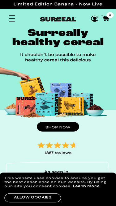94%Surreal is a high-protein, zero sugar, keto-friendly gluten-free, and plant-based cereal. Available in Cocoa,Cinnamon,Frosted and Peanut Butter. It shouldn't be possible to make healthy cereal this delicious.