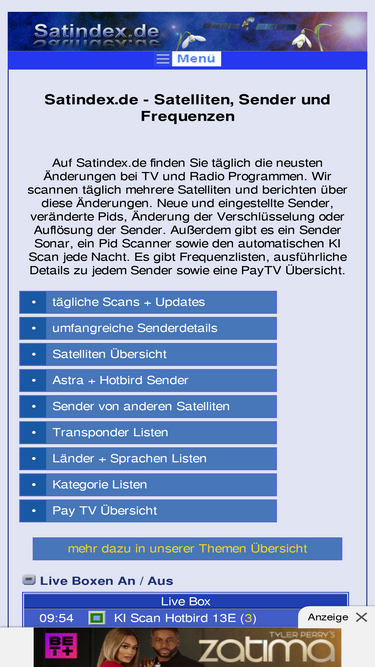 85%Listes des chaînes de télévision selon les pays ou les satellites avec les fréquences des transpondeurs. Satellites Astra, Hot Bird, Nilesat, Arabsat Badr, Eutelsat et d'autres. Pricipalement les satellites avec réception en Europe et Afrique du Nord.