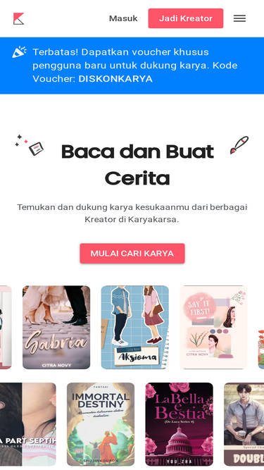 100%nikmati berbagai rekomendasi karya pilihan di karyakarsa. banyak novel terbaru, illustrasi gambar, preset foto secara gratis, dan berbayar dengan harga terjangkau.