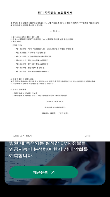 100%에이아이트릭스는 인공지능을 통해 헬스케어 전반의 복잡한 순간들을 연결합니다. 인공지능이 이끄는 새로운 의료 패러다임 속에서 의료진과 환자를 연결하고, 헬스케어의 모든 과정에서 실질적인 가치를 제공합니다.