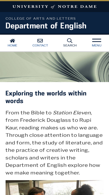 88%Notre Dame's English Department offers graduate and undergraduate degrees with a focus on literature’s cultural and interpretive contexts, creative writing, creative reading, film study, and literary history.