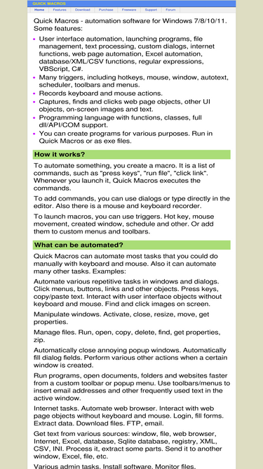 92%automate repetitive computer tasks. macro commands (press keys, run files, ...), programming, recording, various triggers, including hot-keys, mouse movements, menus and window-attached toolbars.