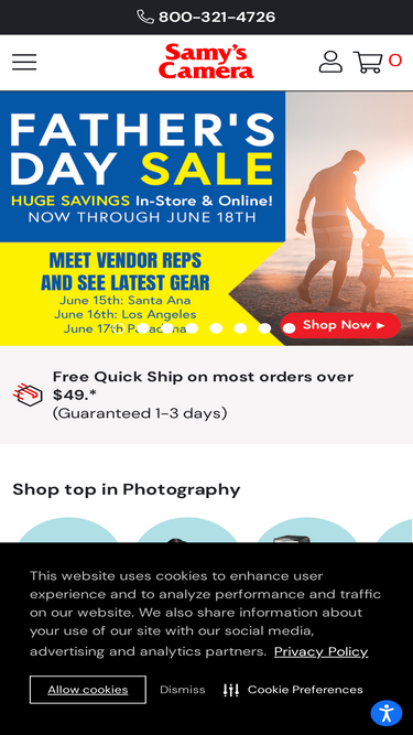 Shop Samy's Camera online or in California for Photography Equipment including New and Used Digital and Film Cameras and Lenses, Video Cameras, Tripods, Lighting and Studio Gear, Underwater Photography Equipment and more from top selling brands, Canon, Nikon, Sony, GoPro, Panasonic, Olympus, Fuji, Leica and more.