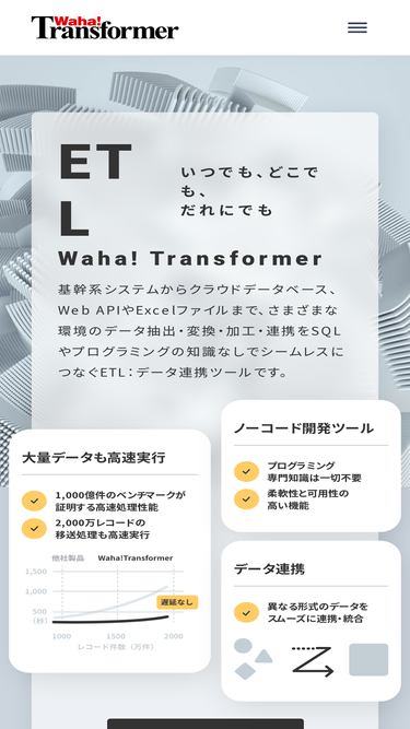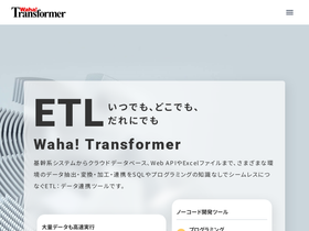 95%Waha! Transformer(ワハ・トランスフォーマー)は、異なる形式のデータをスムーズに連携・統合する純国産ETL:データ連携ツールです。1999年の提供開始以来、大手企業を中心に2,600ライセンスの導入実績。SQLやプログラミングの知識がなくても使いやすいシンプルな操作性と、圧倒的な処理スピードで組織内外のデータ活用を加速します。