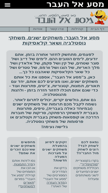 85%מסע אל העבר הוא מאגר המשחקים הישנים הגדול במדינה. יש בו מעל 1000 משחקי נוסטלגיה - כאשר לכל אחד מצורפת הורדה פעילה, סיקור, תמונות ועוד ועוד. כיאה לאתר משחקים ישנים, מסע אל העבר כולל את כל הקלאסיקות שגדלנו עליהם - אלאדין, בונוס, מלך האריות, דייב, טטריס, במפי ועוד. מלבד הורדות, ניתן למצוא גם צ'יטים ופתרונות למשחקים נבחרים, וכמובן שהכל לגמרי בחינם...
