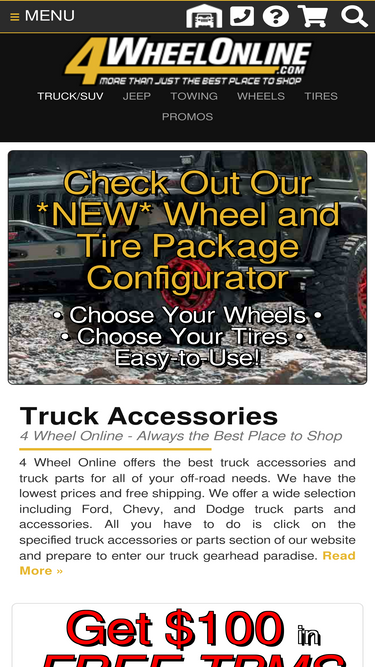 100%Truck Accessories and Truck Parts at the LOWEST PRICES can be found at 4 Wheel Online. We Carry Truck Accessories and Parts from Top Brands and Manufacturers for Dodge, Ford, Chevy, Toyota, Honda and Nissan. Our staff is ready to help you with your purchase. Call us at (813) 769-2451