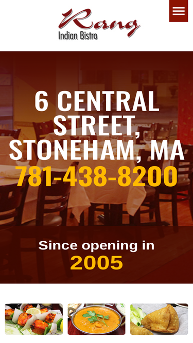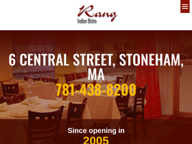 rang indian bistro is an indian restaurant that offers a large variety of vegetarian, poultry, lamb, seafood, and rice specialties. rang also caters to customers with special diet needs such as gluten free dishes. located in stoneham, ma.