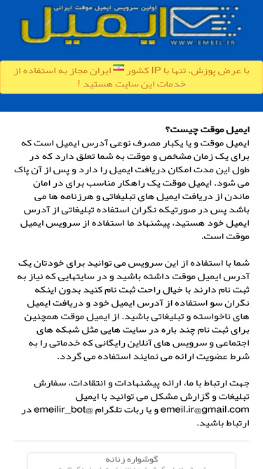 100%ایمیل موقت و یا یکبار مصرف نوعی آدرس ایمیل است که برای یک زمان مشخص و موقت به شما تعلق دارد که در طول این مدت امکان دریافت ایمیل را دارد و پس از آن پاک می شود. ایمیل موقت یک راهکار مناسب برای در امان ماندن از دریافت ایمیل های تبلیغاتی و هرزنامه ها می باشد پس در صورتیکه نگران استفاده تبلیغاتی از آدرس ایمیل خود هستید، پیشنهاد ما استفاده از سرویس ایمیل موقت است.شما با استفاده از این سرویس می توانید برای خودتان یک آدرس ایمیل 20 دقیقه ای (قابل تمدید) داشته باشید و در سایتهایی که نیاز به ثبت نام دارند با خیال راحت ثبت نام کنید بدون اینکه نگران سو استفاده از آدرس ایمیل خود و دریافت ایمیل های ناخواسته و تبلیغاتی باشید. از ایمیل موقت همچنین برای ثبت نام چند باره در سایت هایی مثل شبکه های اجتماعی و سرویس های آنلاین رایگانی که خدماتی را به شرط عضویت ارائه می نمایند استفاده می گردد.