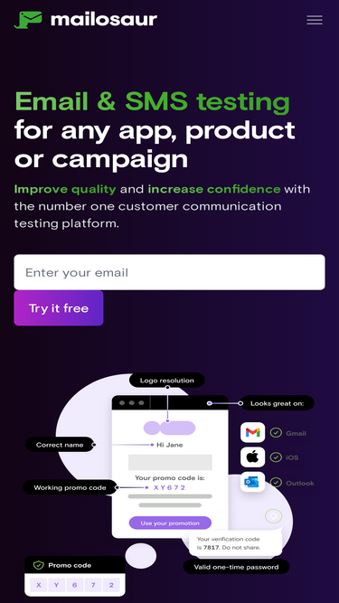 86%The Mailosaur Dashboard lets you manage your Mailosaur account, configure fake SMTP servers and do manual email & SMS testing.