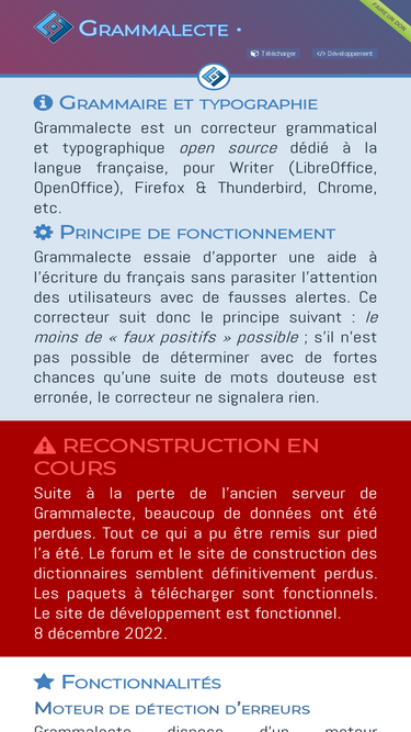 100%grammalecte est un correcteur grammatical et typographique open source dédié à la langue française, pour writer (libreoffice, openoffice), firefox & thunderbird, chrome, etc.
