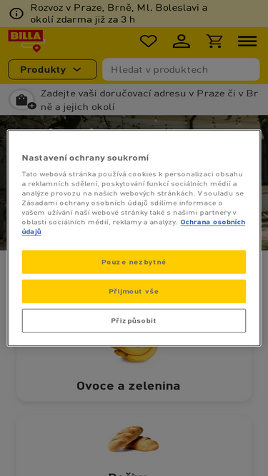 92%V BILLA e-shopu najdete tisíce produktů online. Nákup vám v Praze, Brně a dalších městech Středočeského a Jihomoravského kraje a jejich okolí dovezeme již za 180 minut.