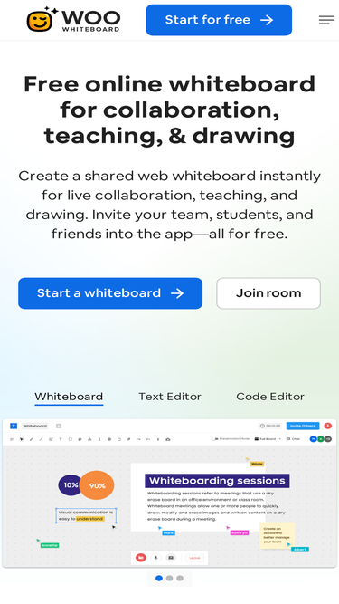 85%woowhiteboard is a free online whiteboard app built for live collaboration, teaching, tutoring, and drawing. create a shared web whiteboard instantly and invite others.