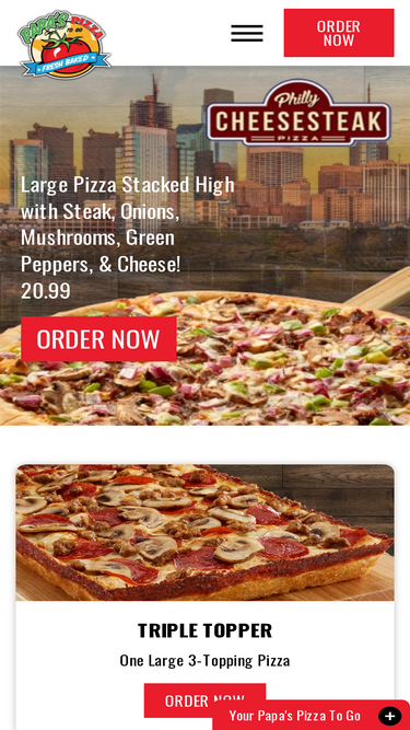 100%Papa's Pizza To-Go provides a diverse menu featuring pizza, breadsticks, hot and cold subs, chicken, salads, pastas and desserts.