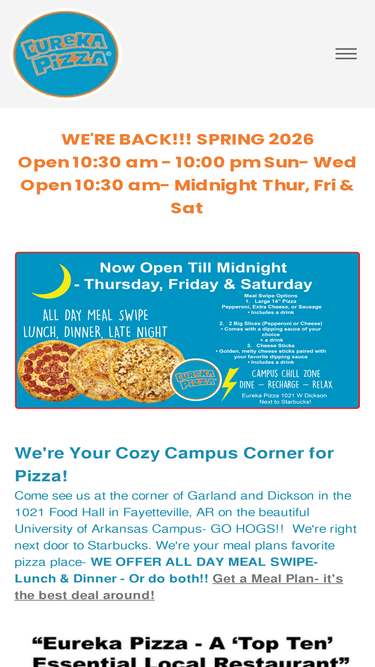 100%eat local! eureka pizza has provided you fresh, fast & affordable pizza for 30 years. we have locations in fayetteville, fort smith, siloam springs, springdale & rogers.