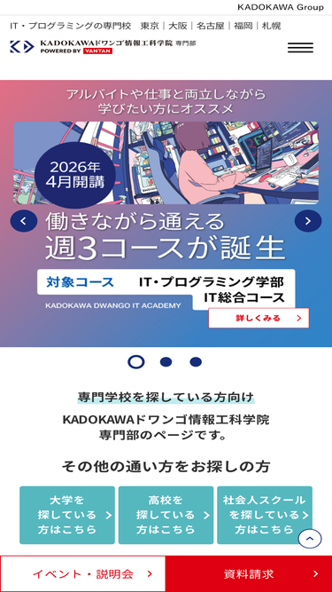 92%よくある質問の紹介ページです|【専門部】プログラミング・WEB・アプリ開発・ホワイトハッカーなどのIT技術を幅広く学べるITの専門校【KADOKAWAドワンゴ情報工科学院 専門部】(東京・大阪・名古屋・福岡・札幌)は、IT分野のプロを育てる専門校です。業界即戦力を育成するため各業界の第1線で活躍する現役プロ(講師)による実践教育や企業との産学協同、個性を伸ばす教育が特長です。