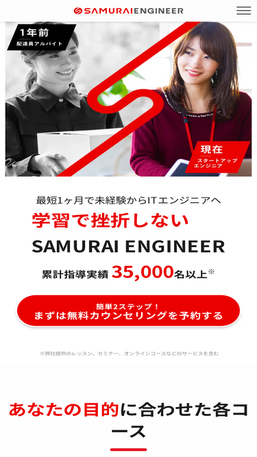 100%SAMURAI ENGINEER(侍エンジニア)は、日本初の専属マンツーマン指導のプログラミングスクールです。オリジナルカリキュラムによって、世界で唯一のオリジナルアプリを開発し充実したポートフォリを作成することが出来ます。まずは無料カウンセリングをぜひご予約ください。