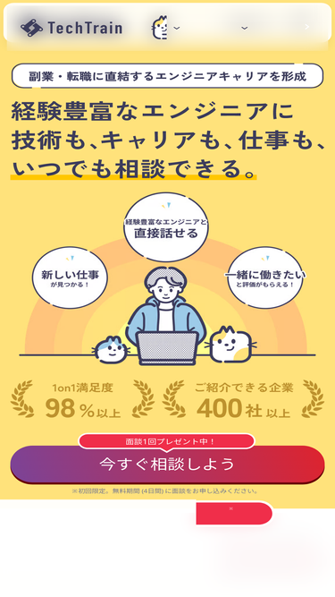 CTO、VPoE、シニアクラスのメンターが多数が在籍。技術も、キャリアも、仕事も、いつでも相談できる。就職・転職・副業に直結する、学びとキャリアのプラットフォーム。