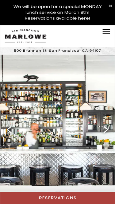 100%Opened in 2010 and relocated to its current location in 2014, Marlowe is a New American bistro located in San Francisco’s Soma neighborhood. Marlowe focuses on classic comfort foods with flavorful twists like the signature Marlowe Burger and quail egg topped steak tartare.