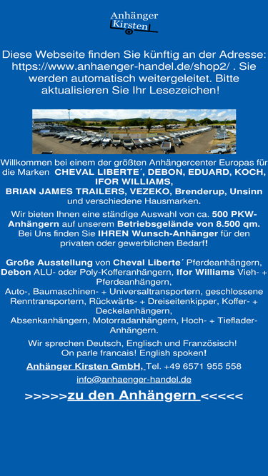 61%anhänger handel kirsten in 54516 wittlich an der autobahn a1 a48 rheinland-pfalz - wir liefern alle anhänger und haben ständig 400 anhänger von humbaur, anssems, brenderup, koch, hulco, thule, unsinn, neptun, ifor williams und cheval liberte auf unserem betriebsgelände