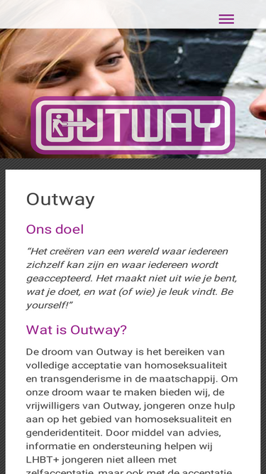 100%Stichting Outway helpt LHBT+ jongeren en jongvolwassenen in Nederland met zichzelf zijn; thuis, op school, op clubs en op het werk.