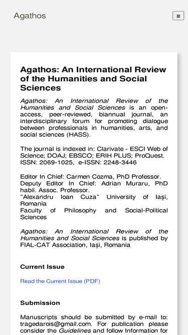 86%agathos: an international review of the humanities and social sciences is an open-access biannual peer-reviewed journal, indexed in prestigious databases.