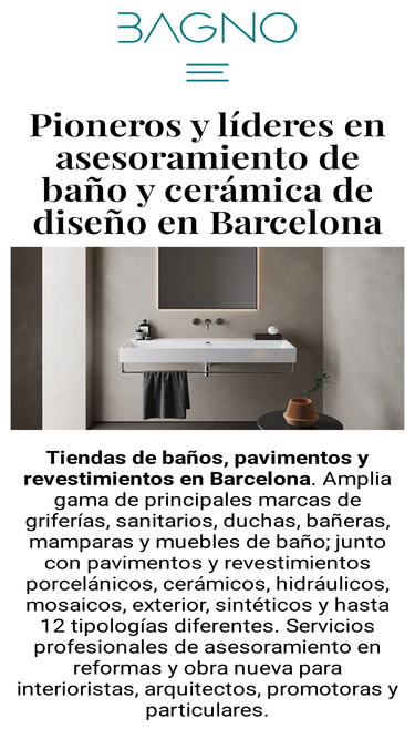 93%Datos de contacto Tienda de baños Gran Vía Corts Catalanes, 494 08015 – Barcelona +34 934 546 490 info@tonobagno.com Tienda de pavimentos y revestimientos c/ Viladomat, 118 08015 – Barcelona +34 934 586 836 info@tonobagno.com Horarios L 9:30h - 13:30h | 15:30h - 19:00h M 9:30h - 13:30h | 15:30h - 19:00h M 9:30h -